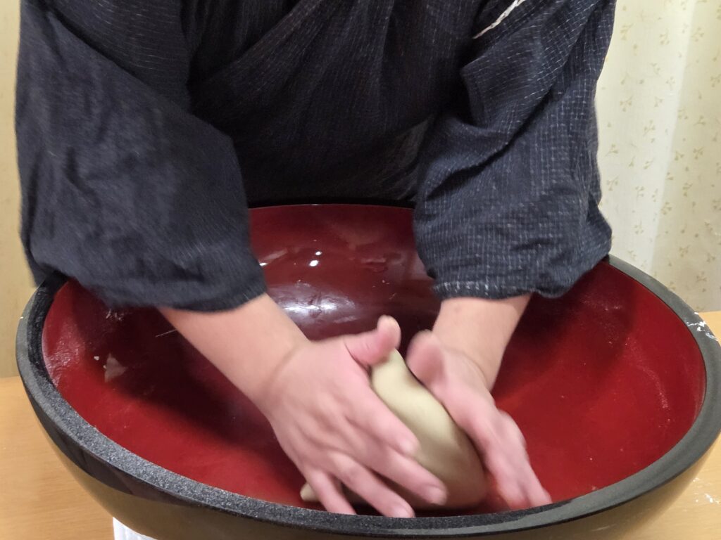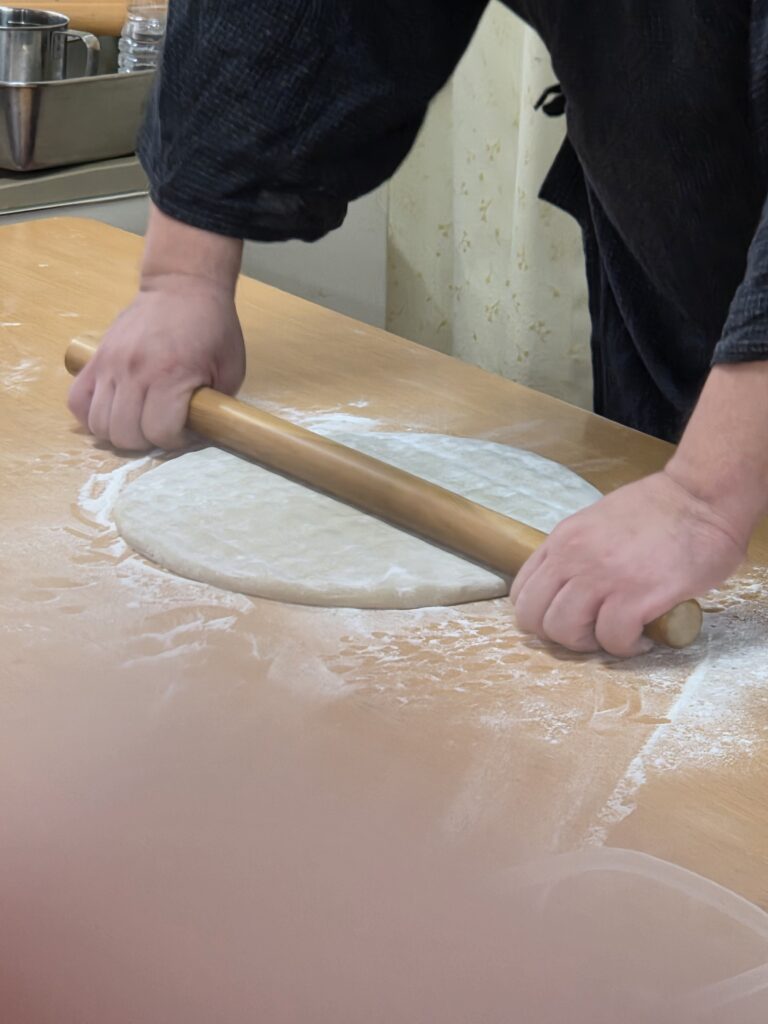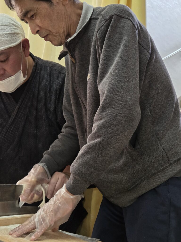 目の前で蕎麦打ちを見たり実際に触ってもらったりしました♪