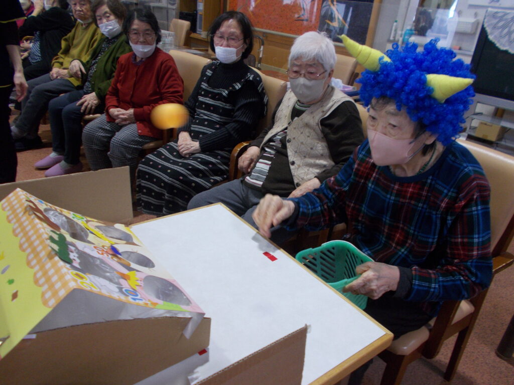 鬼退治‼ 2024.2.15 今週のデイサービスのレクリエーションは… 【鬼退治‼】です(*^-^*) 5つのピンポン玉を各点数がついている穴に入れて 合計点数をチームで競い合います! プレイする人は鬼の被り物を付けます!(^^)! 赤鬼チームと青鬼チームに分かれて‥ みなさん、コツを掴むのが早くて高得点の争いになりました( ゚Д゚)!